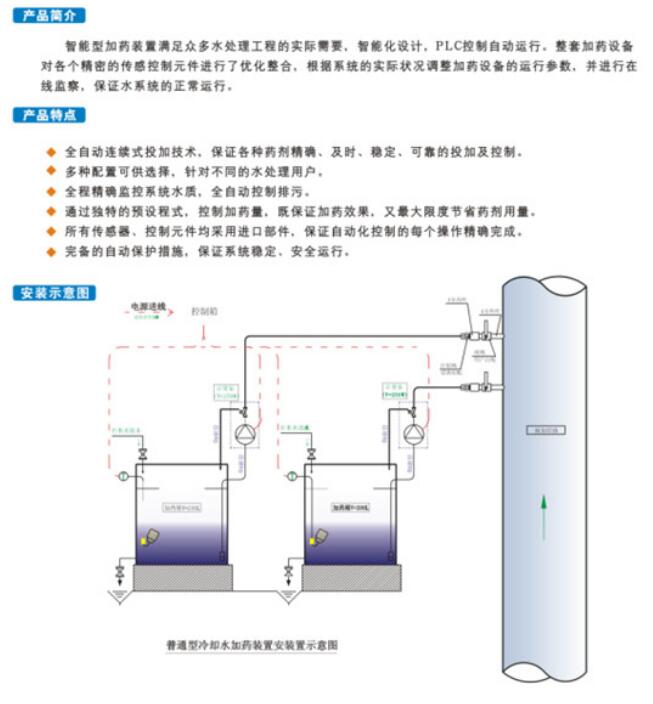 此智能模塊控製,采用在線酸堿度PH檢測儀,根據循環水中加入藥劑的濃度,控製加藥量,比如冷凍水係統,按照水處理要求PH值在7.5-9.5之間,加入水處理緩蝕阻垢劑後,循環水PH值要求在9-9.5左右,如果設定PH在9.4停止加藥,那麽在水中藥劑達標的情況下,加藥泵就停止工作,待藥劑消耗到一定程度,達到低限的時候,在PH7.2時,監測係統將信號反饋給控製係統,再啟動加藥,加藥泵就會開啟,到藥劑濃度達標,PH9.5時,監測係統又將信號反饋給控製係統,加藥泵停止工作。使藥劑濃度始終保持在一個正常的範圍。