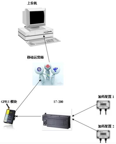 控製係統西門子一個PLC  S7-200負責采集兩個加藥裝置的各種狀態和各種參數,PLC采集完成後通訊一個GPRS模塊無線上傳到連到英特網的遠程上位機的OPC數據庫中,上位機安裝組態王工業組態軟件,通過訪問上位機中的OPC數據庫對接收到的數據進行歸檔、記錄等,方便日後查詢和打印。具體配置如下: